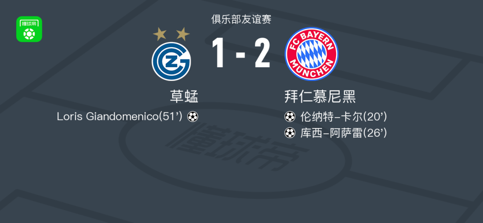北京时间8月13日,一场俱乐部友谊赛在草蜢与拜仁慕尼黑之间展开。比赛第20分钟,拜仁慕尼黑球员比朔夫送出助攻,伦纳特-卡尔成功破门,为球队首开纪录。第26分钟,伦纳特-卡尔又送出一次助攻,库西-阿萨雷把握机会再下一城。第51分钟,草蜢球员马凯斯助攻Loris Giandomenico打入一球,为球队扳回一城。最终,比赛以草蜢1-2不敌拜仁慕尼黑。