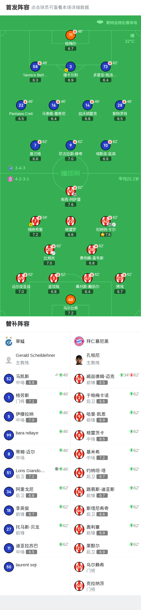 拜仁2-1草蜢,卡尔传射建功,阿萨雷破门,迪亚斯失良机
