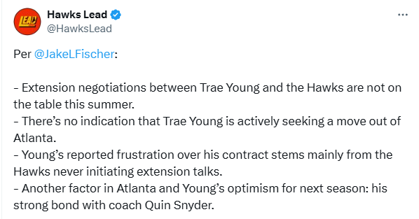 谈到特雷-杨的续约情况,Jake Fischer报道,消息人士透露,老鹰和特雷-杨暂无今夏开启提前续约谈判的计划,不过这也并不让人感到意外;特雷-杨方面已经接受了这样一个事实:打完合同中确定的最后一年,而不是争取提前续约。之后他将在明夏面临决定,是否执行26-27赛季4900万的球员选项。